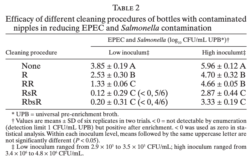The below image is of Table 2 from this study. “R” stands for rinse, “s” soap, and “b” brush (scrubbing). The key is to look for the rows where the number before the +- is below 4. Rinsing only can produce clean enough bottles, especially when they are clean to start (low inoculum column).