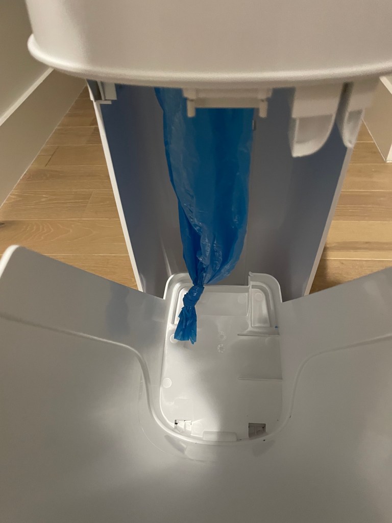 Second is diaper capacity. The DG is narrower than the US, and its trash bag is even narrower, noticeably narrower than a standard trash bag. The Wirecutter estimates 15 diapers per bag for the Diaper Genie and is not specific with the Ubbi Steel. Wirecutter says other pails held 20-30 diapers, but it also says that the US held a week’s worth of diapers. If your baby is only producing 30 diapers per week, God bless you; ours produces about 30 every 4 days. I felt the Diaper Genie held at least 20 diapers. Whatever its capacity, I did not mind the smaller size: taking the dirty diapers out provides an activity to break up being inside so much.[2]