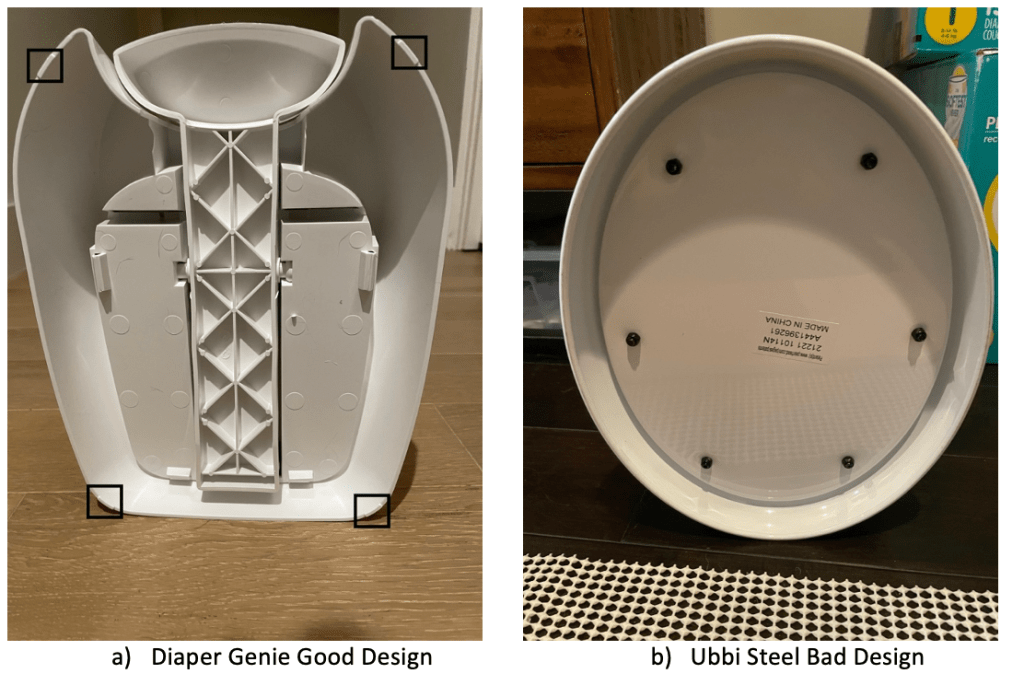 Speaking of scuffing and poor design, check out Image 3. The Diaper Genie has high friction nubs on their bottom while the Ubbi Steel has nothing equivalent. The Diaper Genie therefore holds its place on the floor while the Ubbi Steel does not. In other words, the Diaper Genie will not mess up a non-carpet floor while the Ubbi Steel will. The US’ lack of high-friction nubs would not be an issue if inserting soiled diapers was not the turbulent affair I just described.