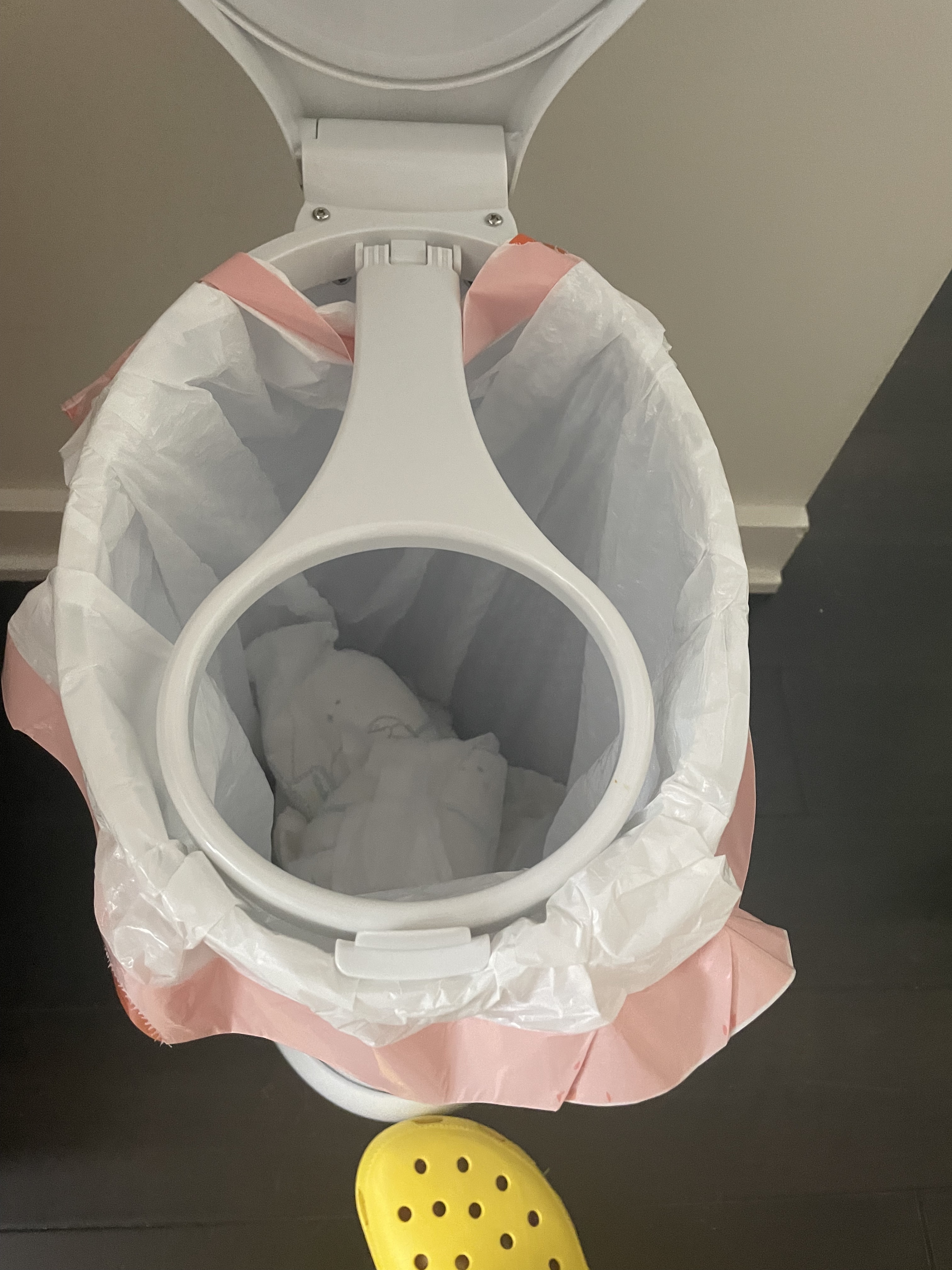 Finally, I am pretty sure the inner loop that one is supposed to put the trash bag around is counterproductive. Image 4 shows what happens when you raise the lid. You can see that the circular opening of the tongue sits right above a plastic loop. According to the US’ instructions, one puts the trash bag through that hoop and wraps the bag around it so that the trash bag does not interfere with the seal between the lid and the can. I suppose there is some logic there, but in my experience the incorrect bag placement, shown in Image 4, does not cause odor to leak. The inner loop does, however, reduce how many diapers the pail can hold by reducing how large the trash bag can become. Since the loop reduces the pail’s capacity and does not appear to improve its odor fighting capability, I think it is superfluous.[1]