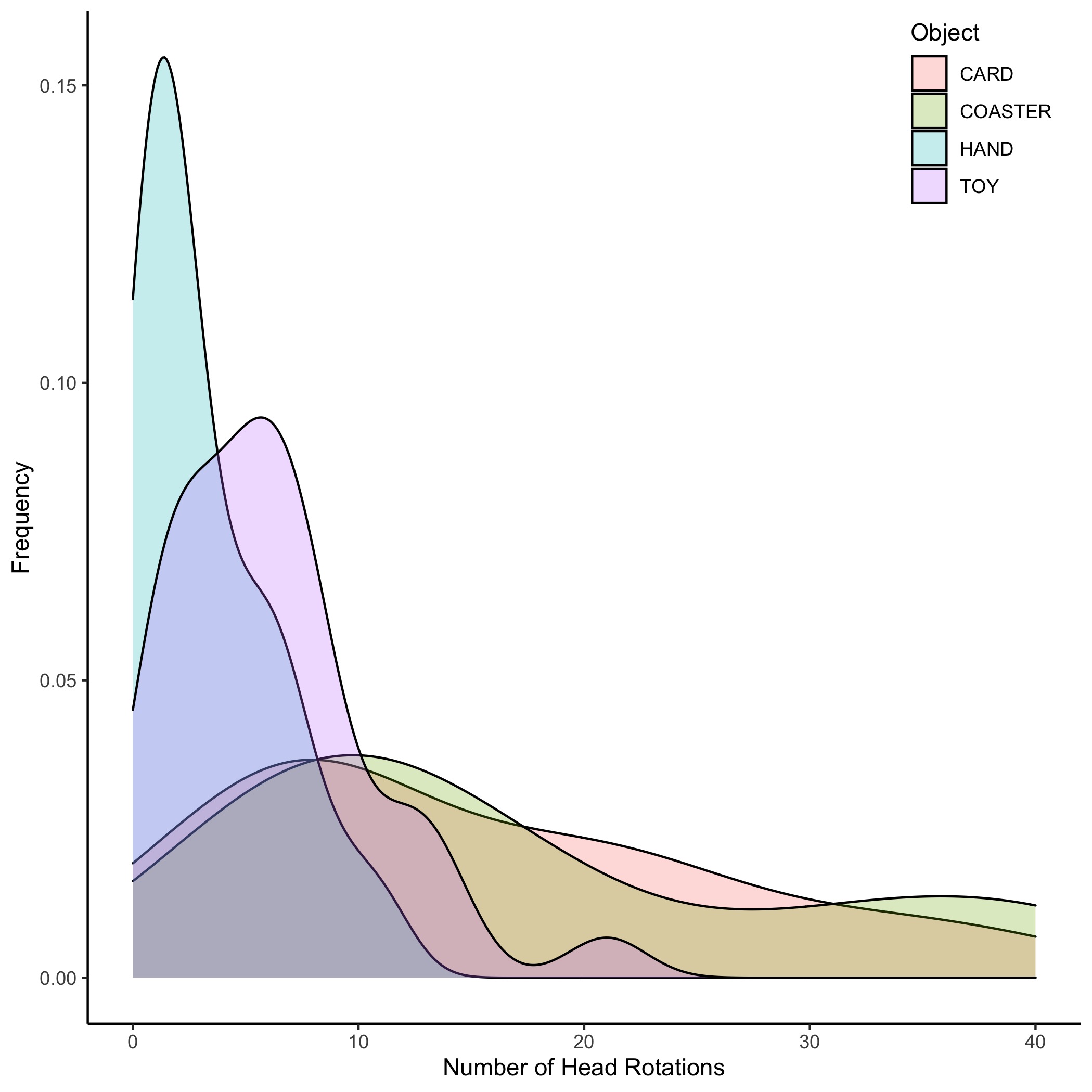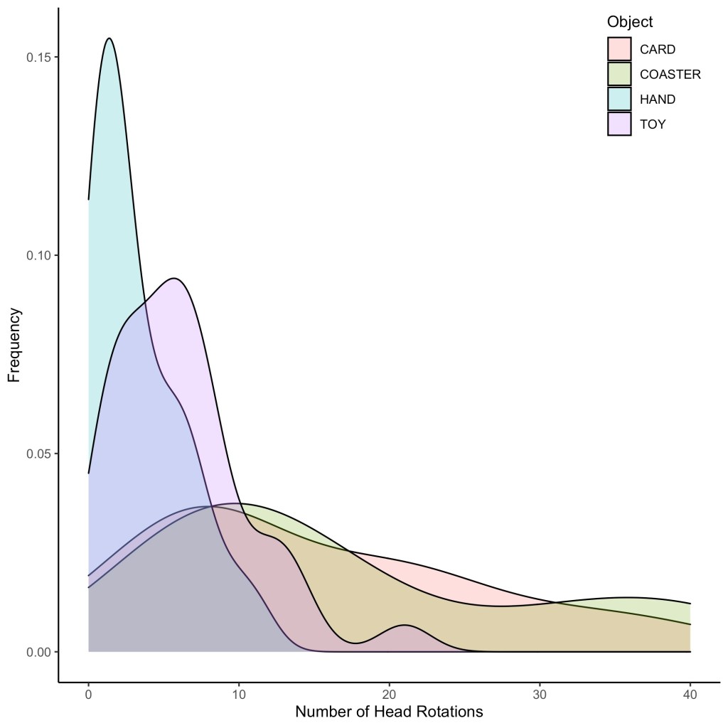 Figure 1 shows the results from this experiment. The x-axis is the number of head rotations, the measure of engagement, and the y-axis is the percentage of times the baby moved her head for each number of rotations. The results are also grouped and colored by object type. For example, the peak of number of observations for my hand is 1, and the wider range of x-axis values for the card and coaster mean there almost as many times that the baby was very interested in them as not. There is a clear ranking of preferences here: the hand is the least interesting, the Winkel toy is the next most interesting, and the card and coaster are equally interesting.